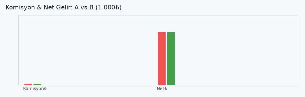 Komisyon & Net Gelir: A vs B (1.000₺) — önce/sonra.